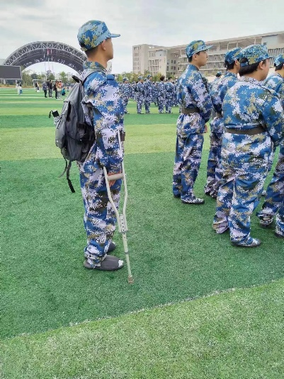 经历数天军训之后,同学们收获颇丰,汗水流淌着欢乐,欢乐包含着收获,总有那么一个双手拄着拐杖的男生,身姿挺拔,眼神坚定。他就是电气工程系电气2315班的温斌同学。 而那个手拄拐杖的男生即使脚踝扭伤也仍然要求参加军训,他即使站在一旁也仍与同学们动作相差无几甚至比一些同学更加标准,眼神坚毅,身姿挺直。