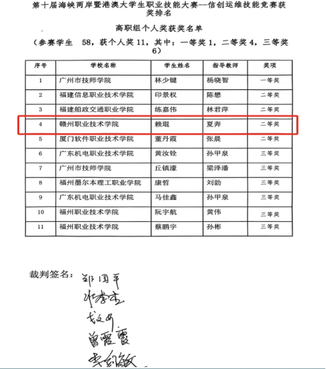 由福建省教育厅、福建省人力资源和社会保障厅、福建省互联网信息办公室等部门联合主办的“2023年第十届海峡两岸暨港澳大学生职业技能大赛”的信创运维技能赛项于11月8日举行,来自海峡两岸的58支队伍同台竞技。我院信息工程系教师夏奔、朱云带领云计算技术应用专业和计算机网络专业4位同学首次参赛,选手赖琨在该赛项荣获二等奖的好成绩。