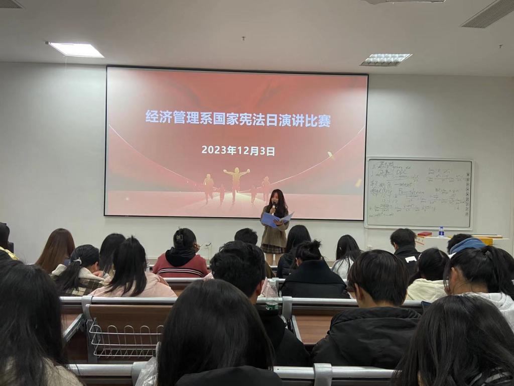12月3日,经济管理系组织了围绕国家宪法日:“大力弘扬宪法精神,建设社会主义法制文化”为主题的演讲比赛。参赛学生以《沐浴宪法阳光,争做新时代青年》《法律在心,守法在行》《宪法之魂在于构建和谐社会》等为演讲题目,用饱满的激情展示了他们对宪法的理解和对法治建设的热切渴望。他们从宪法的基本原则、国家治理体系、公民的权利和义务等方面进行演讲,探讨了宪法在新时代背景下的重要意义。通过这次比赛,希望能够加强青年对宪法的认识,增强青年对法治的意识,培养青年学生们的法治思维和法律素养,提高他们的法律意识和法律素质。全系共有200人次参加了观看。