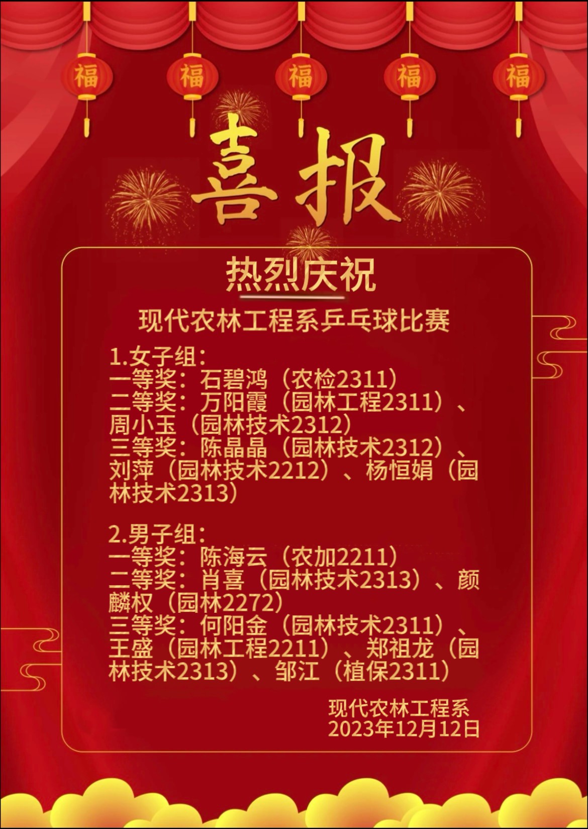 为丰富学生课余文化生活,12月6日至12日,现代农林工程系开展了洋溢青春活力的乒乓球比赛,分为乒乓球男子单打、女子单打两个项目,共有109名学生参赛。