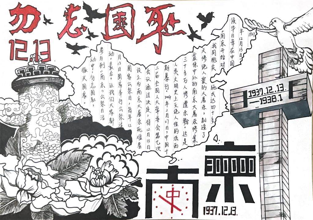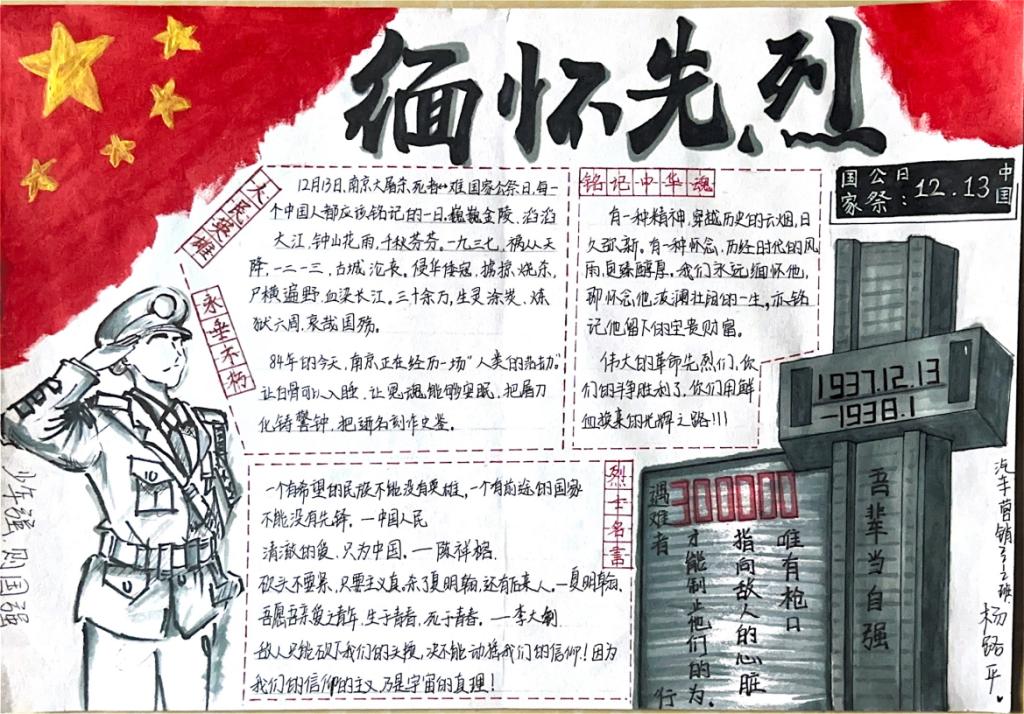 在手抄报作品创作活动中,同学们拿起自己手中的画笔,制作国家公祭日主题手抄报,寄托哀思,表达对先辈们的怀念、对和平的祈愿,坚定了缅怀历史、热爱和平的决心,极大地激发了同学们的责任感、危机感、使命感和爱国热情。