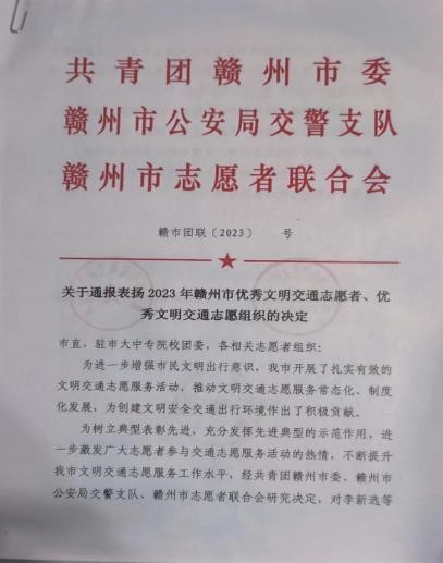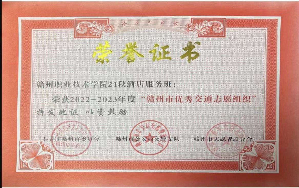 近日,我院现代服务系2021级秋酒店服务班受共青团赣州市委、赣州市公安局交警支队、赣州市志愿者联合会通报表扬,被评为2023年赣州市优秀文明交通志愿者组织。