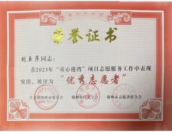 2021级秋酒店服务班班主任刘智临,学生何丽红、廖雅琪、李敏被评为2022-2023年度赣州市优秀交通志愿者;学生黄志祥、刘玉萍被评为2023年“童心港湾”项目志愿服务工作“优秀志愿者”。