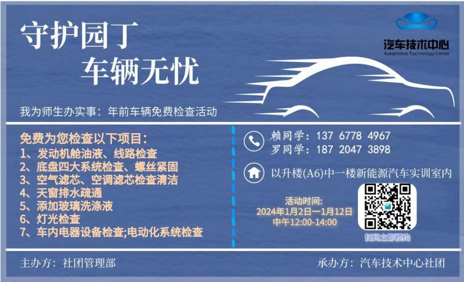 在活动筹备阶段,汽车工程系通过主干道大显示屏海报、微信公众号和微信群等渠道宣传了此次活动的意义和目的,为有检修需求的老师提供了预约途径。同时,汽车技术中心社团内部组建了1个接待组、1个后勤保障组和5个检查组,对组员的专业技能进行了培训及考核。为了活动能顺利开展,检查组制定了详细的检查计划和工作流程。