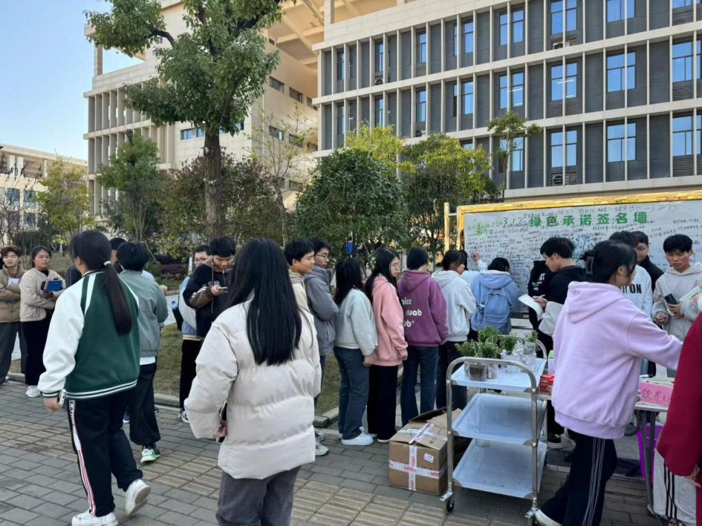 整个活动现场气氛热烈,陆羽楼下排起了长队。有的同学小心翼翼捧着刚种的盆栽,眼神专注而充满期待;有的热烈交流着养护心得。来自现代服务学院的谢同学感叹说:“这次活动让我真正体会到绿色生活的意义,我会从自己做起,把领养的小植物养好,为环保尽一份力。”