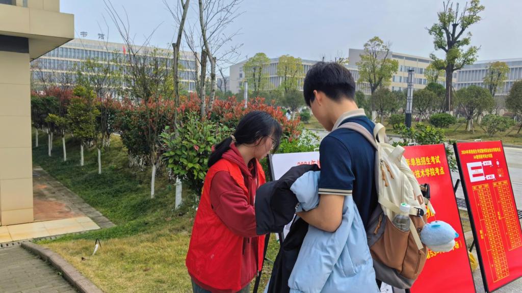 在他们的身后,还有这样一群人,他们穿着红马甲默默无闻,以温柔细致的志愿服务工作,为来自四面八方的考生们“保驾护航”,展示出了不一样的赣职院风采。志愿者们早早的来到校门及各个考点,他们身穿统一的服装面带笑容,耐心地为考生提供帮助和服务。志愿者们的存在也为考生们带来了精神上的鼓励和支持。