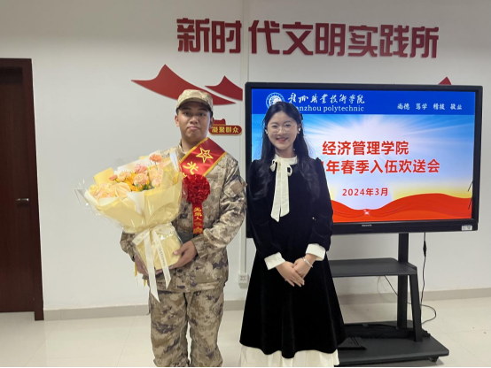 本次经济管理学院共有七名学生光荣入伍,他们分别是2021大数据与会计三年制1班高其敏、卢智建、彭修勇,2021电子商务三年制1班邹陈胜、2021电子商务三年制2班邓赣明 、2021电子商务三年制3班邵猷俊、2021跨境电子商务三年制班胡杨。