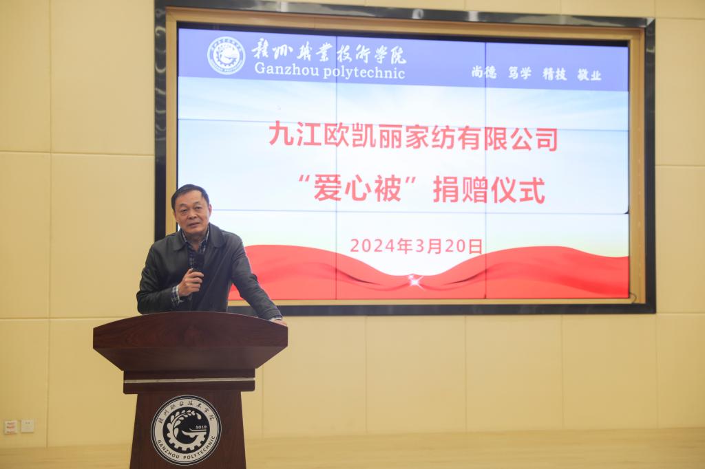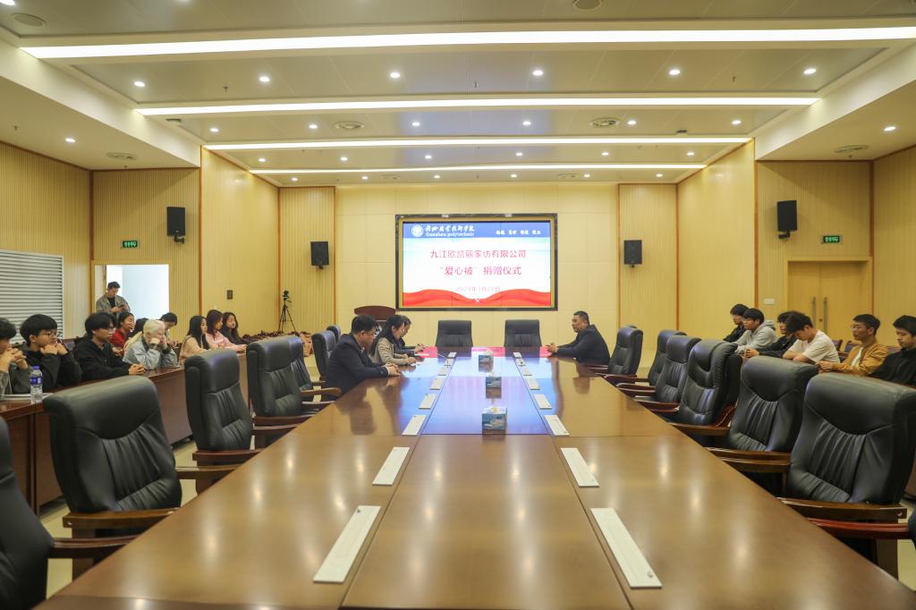 3月20日上午,九江欧凯丽家纺有限公司”“爱心被”捐赠仪式在行知楼二楼会议室举行,学院党委委员、工会主席熊晓林参加捐赠仪式并讲话,仪式由学生管理与就业服务处处长邱欣菊主持,工会副主席欧忠和学生代表参加捐赠仪式。