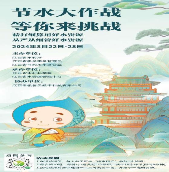 网络答题活动。3月22至28日“中国水周”期间, 水利部牵头在“学习强国”学习平台开展“世界水日”“中国水周”每日答题。在水利部官网、“中国水利”“法治水利”等微信公众号开辟宣传专栏,围绕节水、水资源管理等内容组织开展网络答题活动。省水利厅牵头开展第五期“节水大作战,等你来挑战”节水知识有奖答题活动,普及节水知识,参与方式为通过绿宝碳汇APP开展线上答题,请各二级学院、各部门组织学生、教职工积极参与。