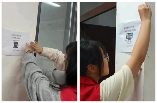在打扫过程中,同学们不仅注重卫生环境的改善,还积极宣传文明卫生的行为习惯。在每一间流动教室打扫干净后,他们在教室里贴上注意卫生的宣传标语,呼吁更多的同学一起维护好公共教室的卫生。