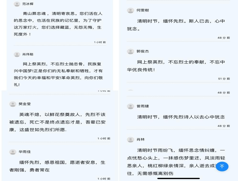 同学们在赣南红客户端平台“清明祭英烈"线上入口,参与祭奠,献花、祭酒、上香、鞠躬等多种方式祭扫英烈,并留言寄语。