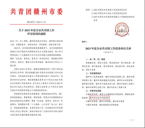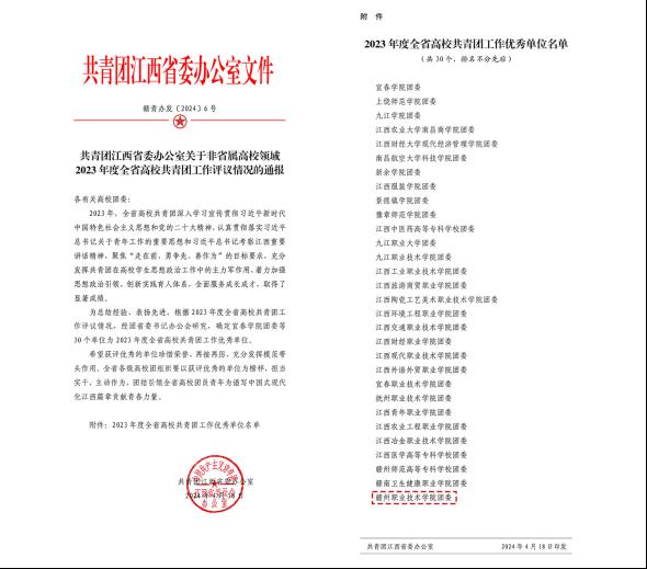 近日,共青团江西省委、共青团赣州市委通报了2023年度共青团工作评议情况,雷竞技电竞平台官网团委荣获“2023年度全省高校共青团工作优秀单位”“2023年度全市共青团工作优秀单位”。