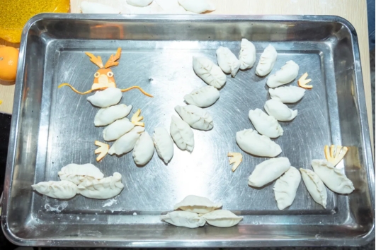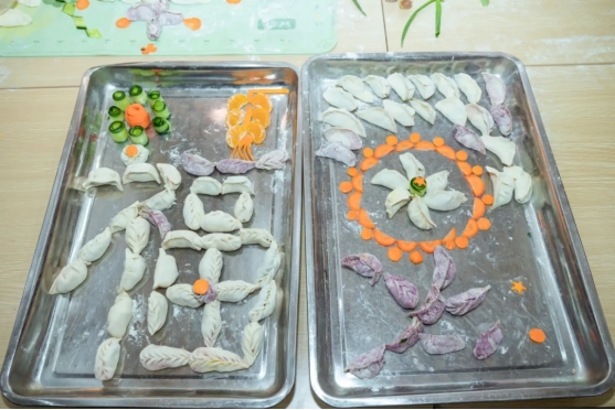 接着,大家分成四个小组分别围坐在一起,迫不及待地大显身手。加馅、折叠、捏合……一气呵成,每位同学都展示出自己独特的包饺子技巧。不少同学还是第一次包饺子,但认真学习一丝不苟包饺子的状态让人称赞。大家逐渐掌握了包饺子技能,包出的饺子还不错,“功底好”的同学还尝试包花式饺子,孩子们创意与技艺齐飞,包出的饺子有的像小笼包,有的像喇叭,有的像元宝,大家忙得不亦乐乎。教师们也参与其中,师生们有说有笑,现场气氛热闹非凡,一盆盆馅料和一片片欢声笑语一起被包进了面皮中,被牢牢捏紧的不仅是饺子皮,还有深厚的师生情谊。