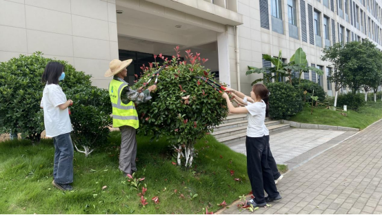 现场分组实践,学生们手持园艺工具,在导师的指导下对校园内的行道树、灌木丛等进行合理修剪,学习控制枝干生长方向、疏剪徒长枝条等技艺,将所学理论知识转化为实际技能。大家在为校园植被“理发”的同时,也体会到了党建品牌“以花育人”的深刻内涵,培养了劳动精神和环保意识,感受到了“绿水青山就是金山银山”的真谛。