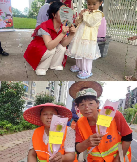 “逃之夭夭,灼灼其华”,妈妈也是温柔的花。孩子们来到了花束台,精挑细选下,亲手将鲜花送到了妈妈手中,大胆向妈妈表达了爱意。在这个特殊的日子,志愿者们也将花束送给辛勤劳作的社区保洁阿姨,将这份爱传递下去,让爱意流于世间。