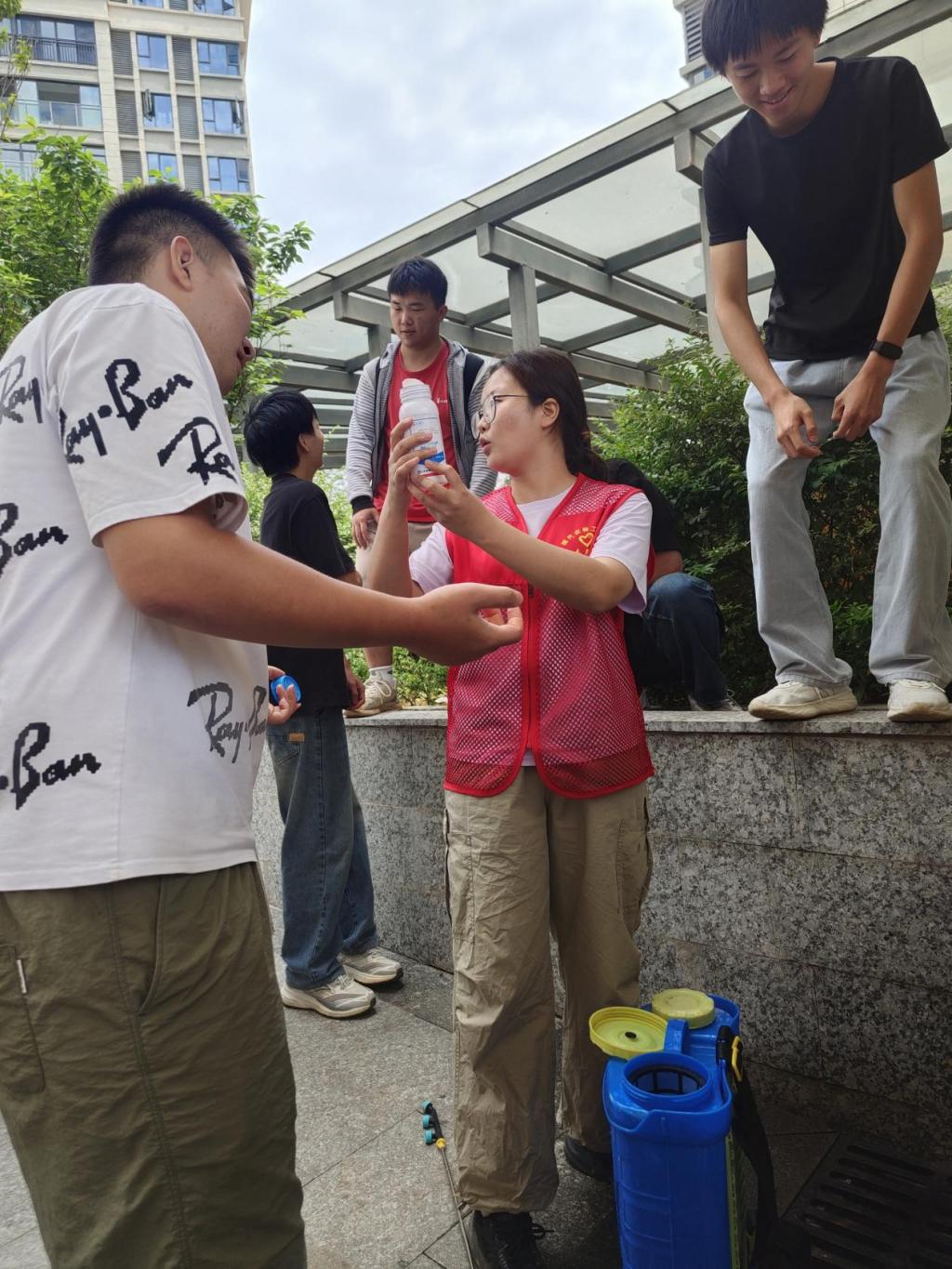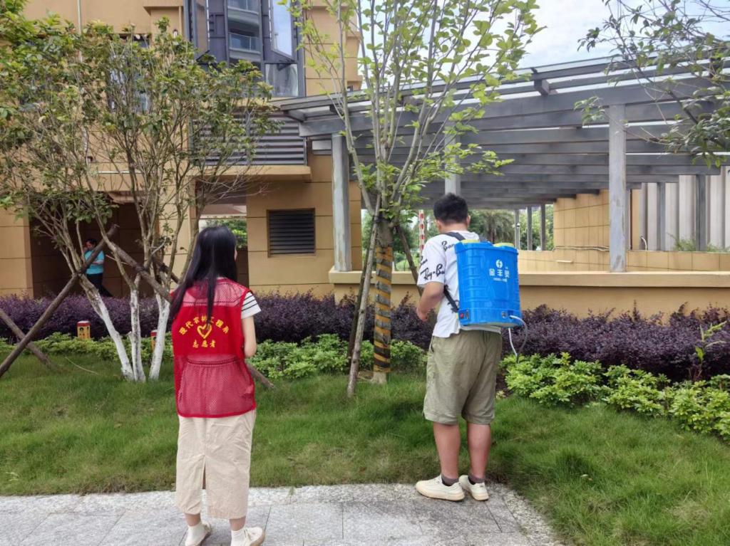为做好防治工作,保持校园内良好的绿化环境,党员干部穿上红马甲,带领学生走进周转房,背起打药桶,对周转房的每一处草坪和绿植喷洒农药。大家发扬奉献精神,不怕苦、不怕累、不嫌脏,将每一处马陆可能栖息的角落都进行了处理。
