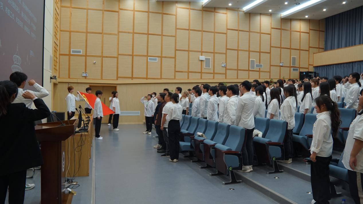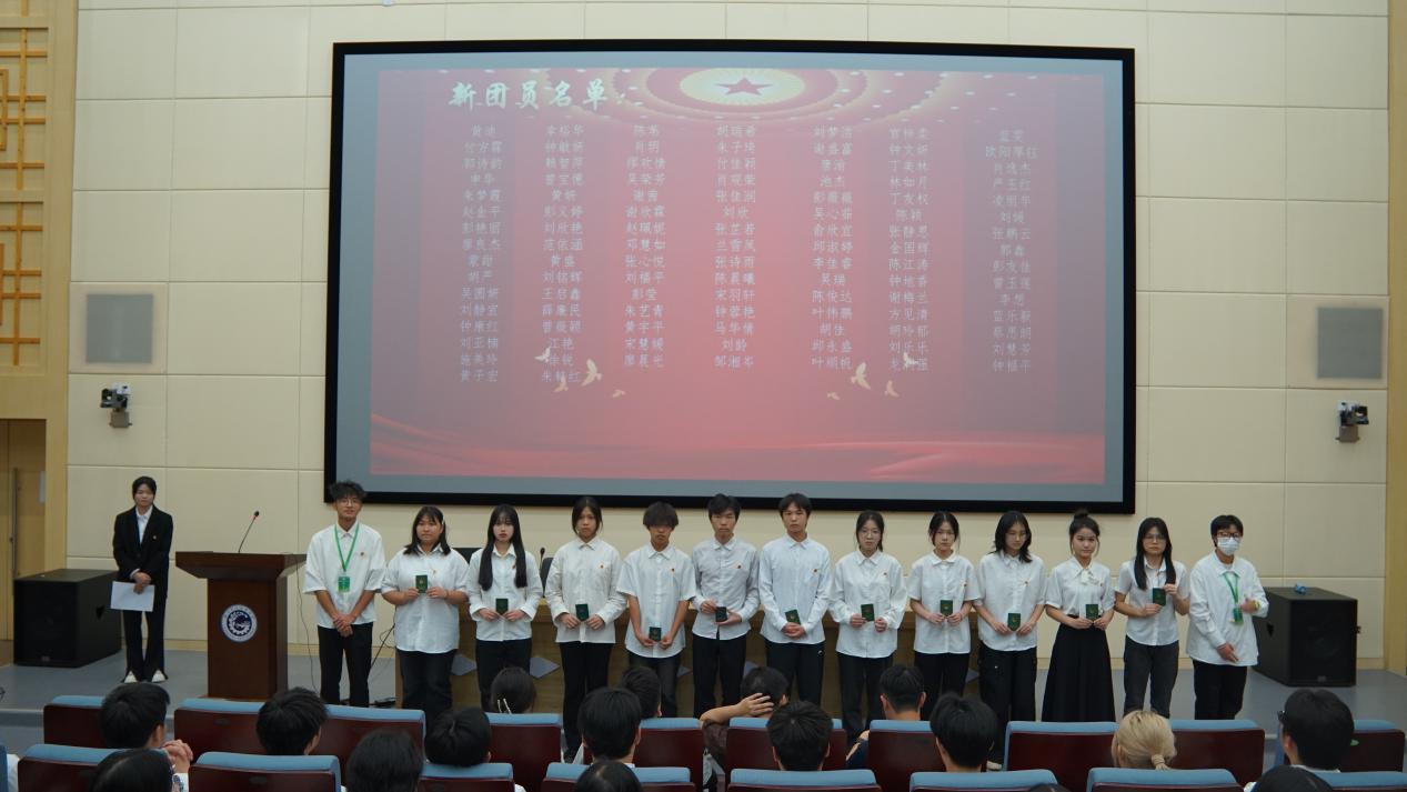 仪式在雄壮的国歌声中拉开帷幕,主持人宣布新发展团员名单,老团员代表为新发展团员代表佩戴团徽,颁发团员证、团章。佩戴完毕,全体团员右手握拳,面向团旗庄严宣誓,时刻谨记作为一名共青团员的权利和义务,真正做好中国共产党的助手和后备军,在强国建设、民族复兴伟业中挺膺担当。