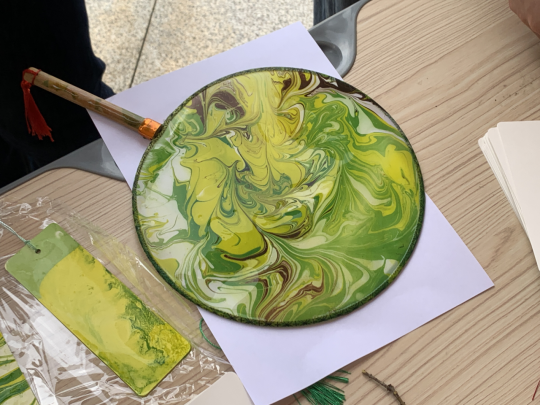 活动中,巧妙地运用了色彩心理学原理,借助水拓画的艺术手法,让参与者在扇面与书签上自由挥洒情绪的色彩。每一滴水的流动,都仿佛代表着情绪的波动与变化;每一种色彩的交融,都象征着情感的丰富与多样。通过这种方式,我们鼓励大家用艺术的方式来表达内心的感受,进一步促进情绪的积极转化,让情感得到更加舒适地释放与舒缓。