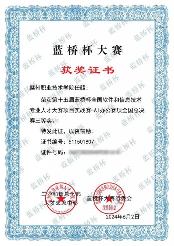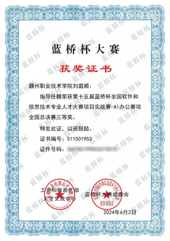 备赛期间,学子任赣展现出了极高的学习热情和顽强的拼搏精神。同时,刘庭顺老师针对蓝桥杯竞赛的特点,制定了详细的实训计划,为学生提供专业指导,帮助学生熟悉比赛流程,不断提升解决实际问题的能力。最终,学子任赣凭借扎实的专业基础和出色的实操能力,一路过关斩将,最终在全国选拔赛与全国总决赛中取得佳绩。