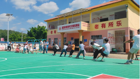 最后,志愿者们与小朋友们来到港湾广场进行了精彩绝伦的拔河比赛。所有的小朋友们分为两组整装待发。比赛开始,一声哨声,声声呐喊,双方队员双方队员齐力而动。在蓝天下锤炼身体素质,在力竭中收获团结精神。快乐的时光总是短暂的,我们的童心港湾就到此告一段落,希望夏潭儿童们可以茁壮健康成长。