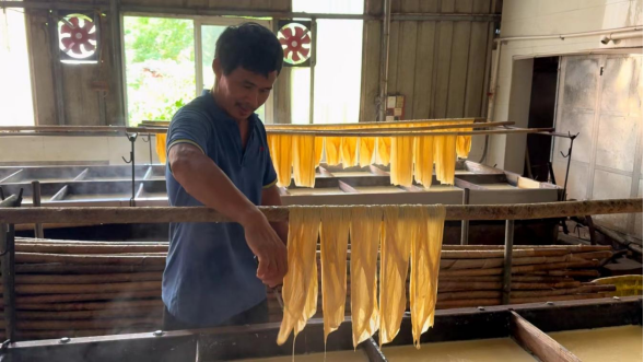 下午,实践队员们来到村里的腐竹制作工坊,见证黄豆到腐竹的奇妙蜕变。选豆去皮、泡豆、磨浆甩浆、煮浆滤浆、提取、晒干、包装......腐竹繁琐的制作流程使实践队员们被基层劳动人民的智慧所深深折服。自2015年创办至今,该工坊一直延用最传统的腐竹制作工艺,制作过程中不放入任何添加剂,坚持运用古法炒浆、挂浆工艺,保证腐竹的原汁原味。当地许多顾客在吃了后,都纷纷称赞。厂内员工仅有厂长夫妻二人和一个小工,厂长夫妻二人每天一起床就忙碌不停,在小小的厂房里,每天要忙碌15个小时左右。虽然制作过程艰苦,但只要想到是通过自己的努力和坚持能让当地群众吃上最正宗的腐竹,再苦再累也值得。