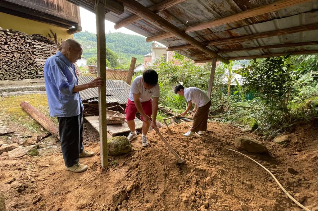同学们先是来到89岁的李宗常爷爷家,帮助老爷爷修建堆放柴火的寮棚。同学们或整地,或帮忙运木头,在李爷爷家干的如火如荼。在劳动过程中得知李爷爷自1956年12月入党,至今有78年党龄,他一直默默奉献在农村基层,曾担任过20年的小学校长,用知识改变山里孩子命运,为村庄的教育事业做出了自己的贡献。