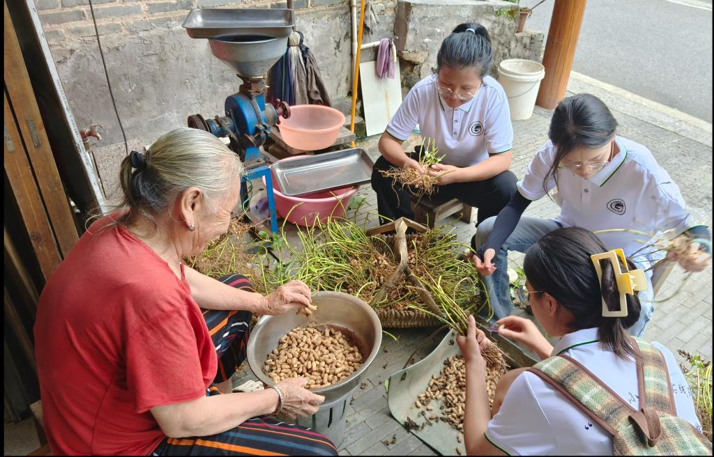 返回途中,一位老奶奶独自坐在自家门前佝偻着背,认真地一颗颗摘着花生。实践队员们毫不犹豫地停下脚步,搬来小板凳与奶奶一起摘花生。摘完花生后,奶奶连声说:“孩子们,你们真是太好了!谢谢你们帮忙。”