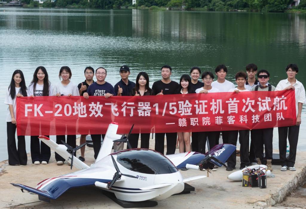 随后,学生分组参与飞行器结构组装,亲手体验航空制造的关键流程并完成地效飞行器的组装,师生团队前往上犹县阳明湖,参与菲客航空最新研发的地效飞行器试飞。这款外形酷似“掠水海豚”的创新飞行器,利用地面效应原理实现贴水巡航,兼具飞机与船舶的特性。试飞过程中,飞行器在湖面平稳滑行,展现出优异的技术性能,引发师生对低空经济应用场景的广泛讨论。