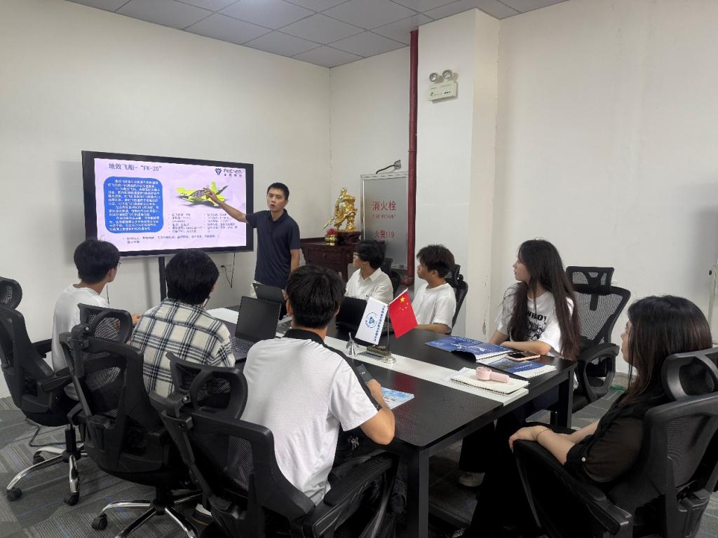 在长期合作开展地效飞行器项目研发的基础上,师生团队此次到访受到菲客航空科技公司的高度重视。负责人王子欣亲自接待实训团队,针对低空经济新赛道,公司重点展示了包括地效飞行器在内的核心技术突破与商业化应用场景。在长达两小时的交流中,校企双方围绕航空科技企业的商业模式创新、技术转化路径等议题进行了深度研讨,师生团队结合前期项目经验提出了多个具有实践价值的建议。