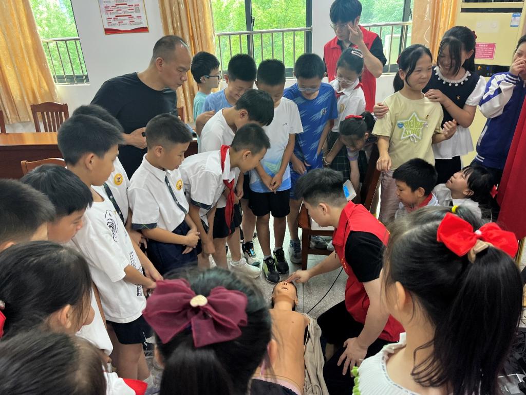 活动现场,朱文彬老师通过真实案例与互动问答,深入浅出地讲解了溺水高危场所识别、落水自救技巧及安全准则。现场演示了心肺复苏术(CPR)关键步骤和正确救援方法,并组织学生在专业指导下进行模拟演练。这场融合知识讲授与实操训练的“沉浸式”课堂,有效提升了百余名小学生的安全意识和应急能力。