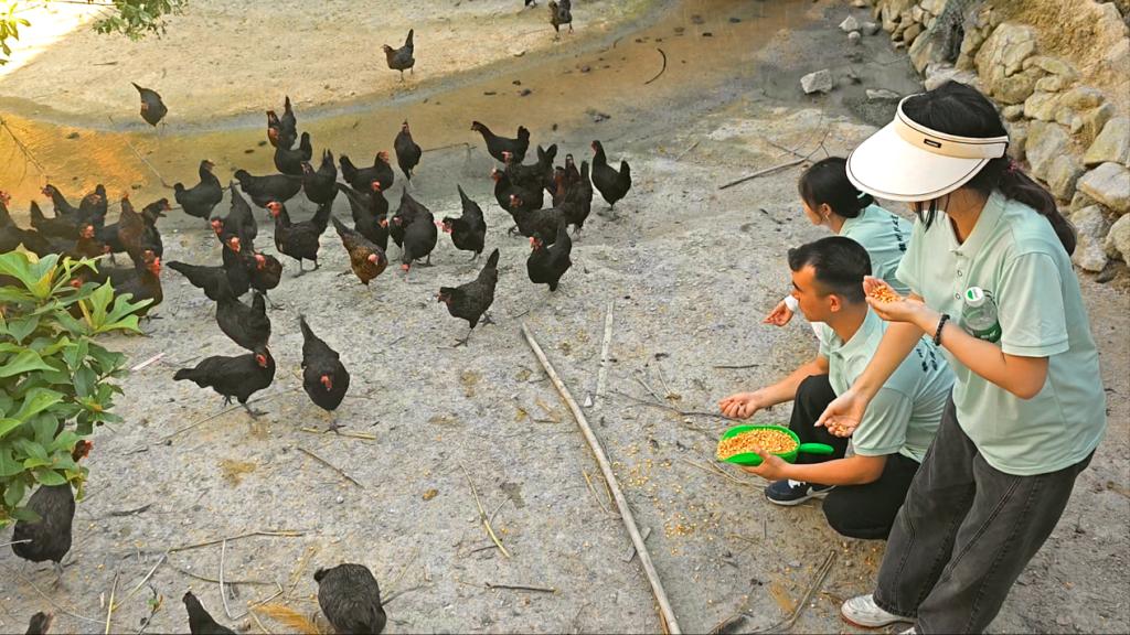 图为团队成员们亲身体验喂鸡的场景。万昊供图