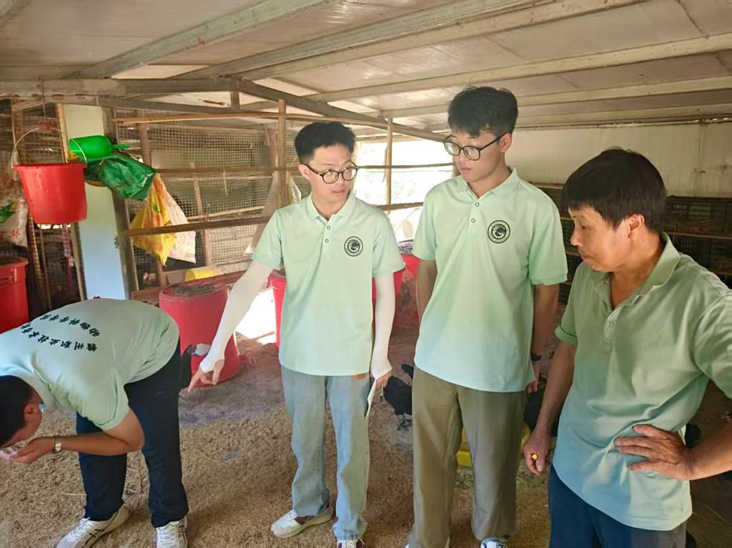 团队深入到杨晓东家庭农场和代表农户陈隆辉养殖场进行现场技术帮扶。在观摩鸡舍饲料投喂操作后,针对即将到来的夏季高温挑战,团队指导老师从专业角度对鸡舍优化建设和畜禽热应激的科学预防,提供了系统、实用的技术建议。