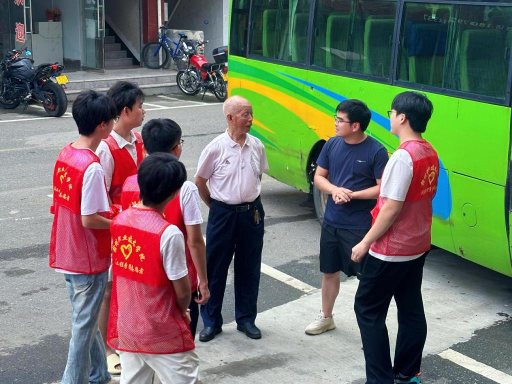 活动伊始,实践队在兴莲客运站前举行简短启动仪式后就立即投入到志愿活动中。兴莲乡作为革命老区,承载着深厚的红色文化底蕴。队员们通过走访当地老人,了解了许多关于兴国县的革命历史。在兴莲客运站,我们有幸认识了一位94岁高龄的陈大爷,通过了解,我们才知道客运站对于当地老百姓的重要性。这座承载着几十年风雨的客运站,是兴莲乡连接县城的重要的枢纽——每天半个小时一趟的绿色大巴,载着村民的希望驶向需要80分钟路程外的县城,又载着生活的必需品和对家的思念归来。站前斑驳的米白色瓷砖、褪色的红色招牌,无声诉说着这里与几代村民密不可分的羁绊。站内的木质长椅早已褪去原色,磨光的扶手和凹陷的坐痕记录着无数等待的身影——有挑着扁担赶集的老人,有抱着孩子求医的母亲,也有外出求学的少年。这些长椅比我们的年龄还大,它们见证了无数的团圆和离别。这座车站承载的不仅是交通功能,更是乡村振兴的缩影。