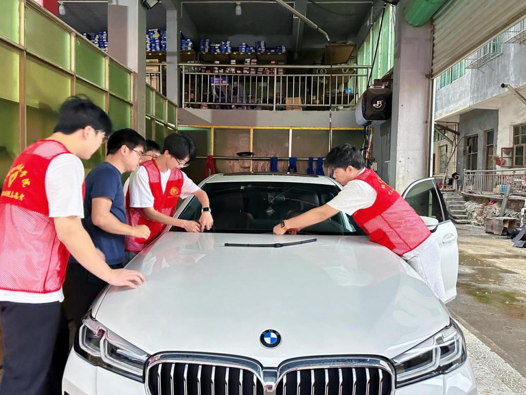 结合专业特色,实践队将“汽车养护课堂”搬到乡村洗车店。在狭窄的巷道内,志愿者们熟练操作高压水枪、擦拭车身,为当地车辆提供免费清洗服务。其中一位车主连连称赞:“学生们技术专业,服务热情,真是帮了大忙!”此外,队员们向洗车店员工传授车辆保养技巧,交流行业新动态,推动专业技能与乡村需求精准对接,既检验了学生的实操能力,也为乡亲们带去了实用技术。