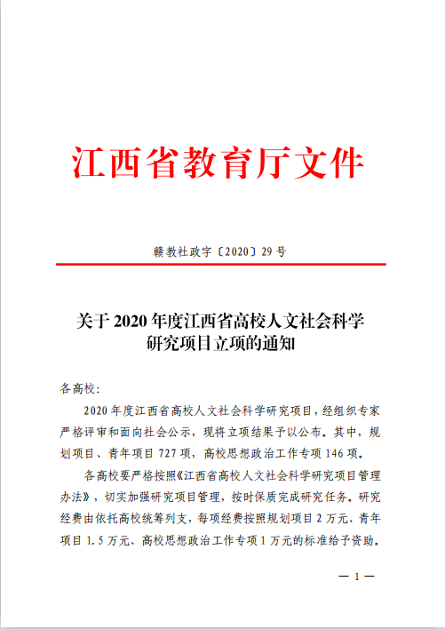 学院高度重视江西省人文社科项目申报工作,将“引导各教学单位重点申报省教育厅纵向课题项目”列入到《雷竞技电竞平台官网2020年科研工作要点》中,积极组织人文社科教师申报。2020年,学院足额申报7项,立项4项,立项率达57%,这也是学院2019年建校以来首次组织申报此类课题,实现了零的突破,且立项过半。